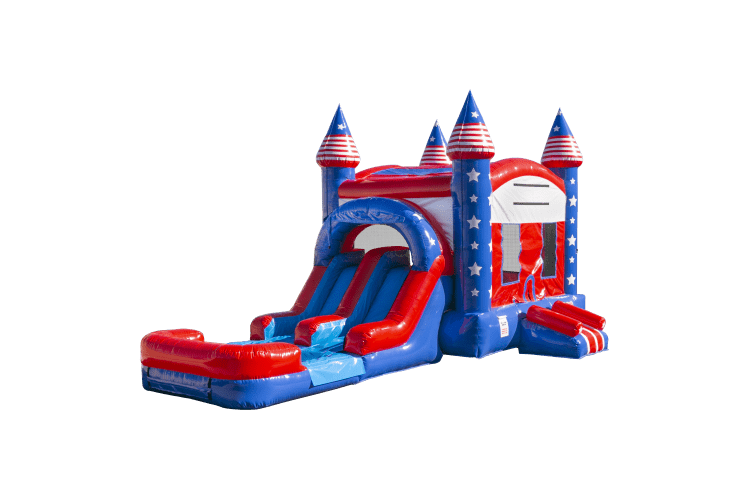 Bring patriotic fun to your next party with our Stars and Stripes Bounce House Combo! This exciting inflatable rental features a spacious bounce area, a climbing wall, and dual lane water slides that end in a refreshing pool at the bottom—perfect for cooling off on hot summer days. With its bold red, white, and blue design, this unit is a favorite for backyard parties, Fourth of July celebrations, Memorial Day, Labor Day, school events, and more.